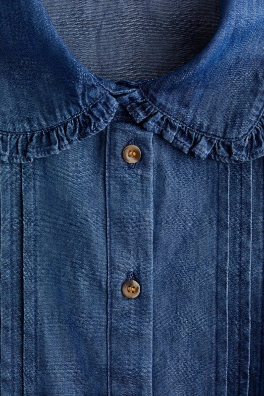 Short, fitted blouse in cotton denim with a frill-trimmed collar, pintucks and buttons down the front. Short puff sleeves with elasticated, frill-trimmed cuffs and a frill-trimmed hem.