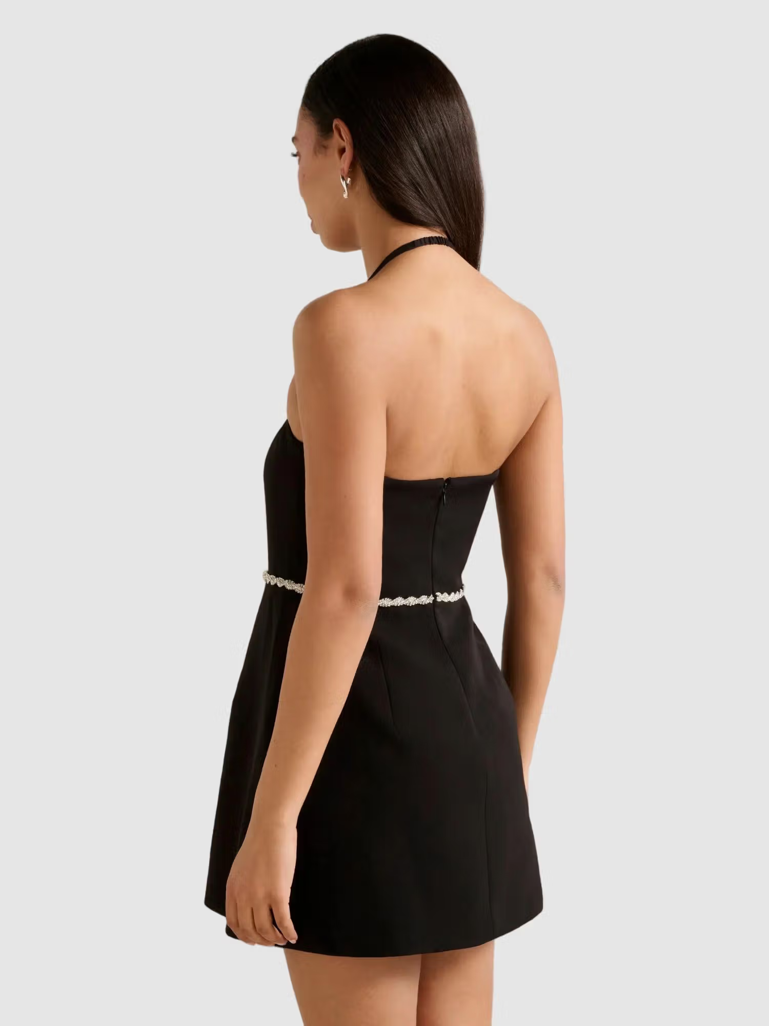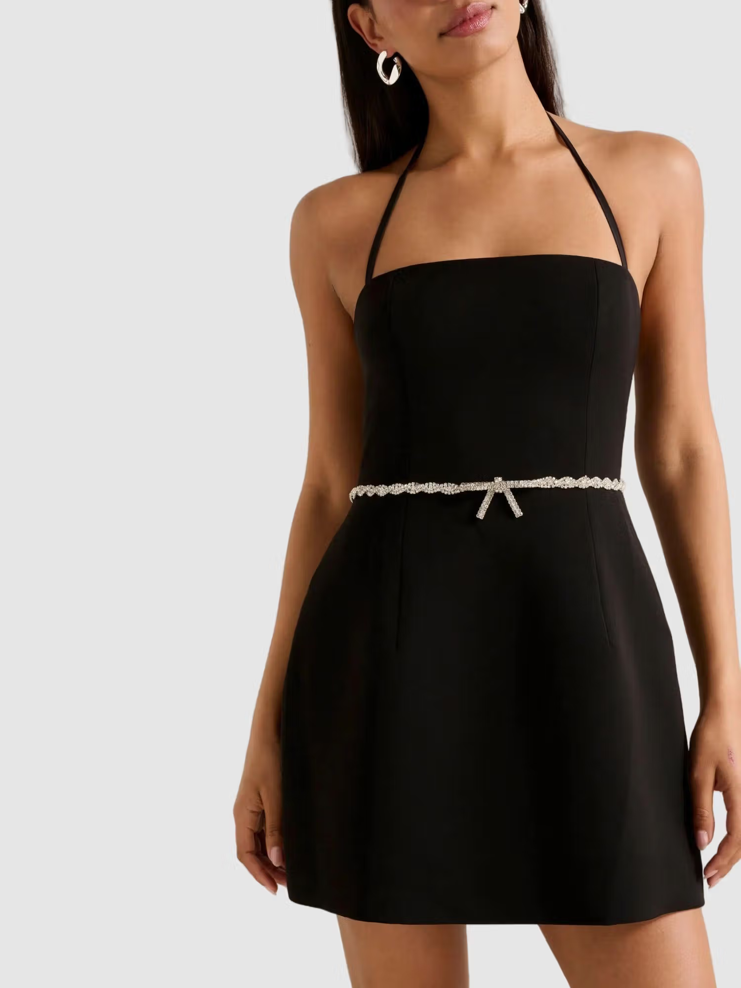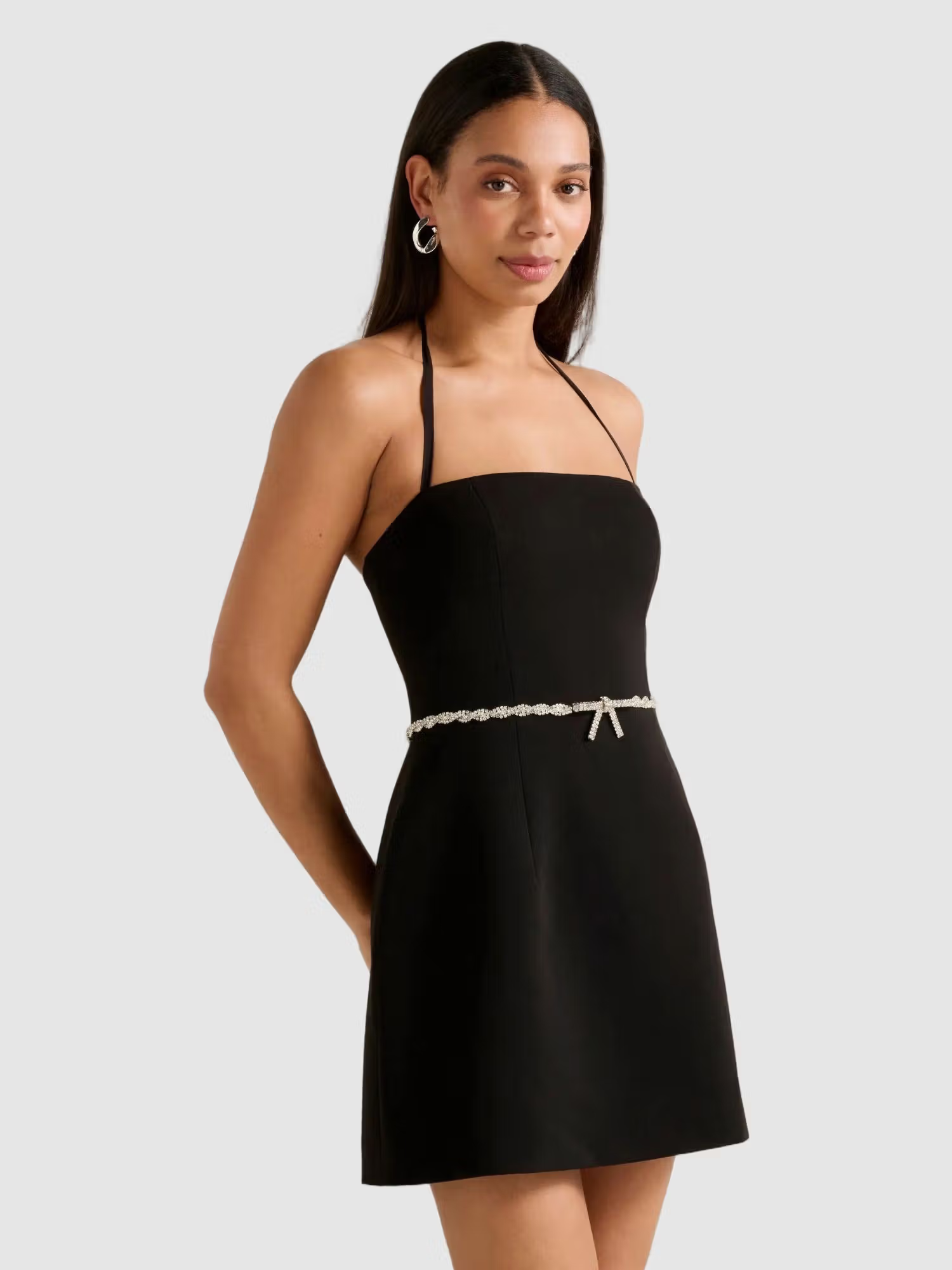 An elegant mini dress embellished with a diamante bow waist, perfect for your next special occasion.
