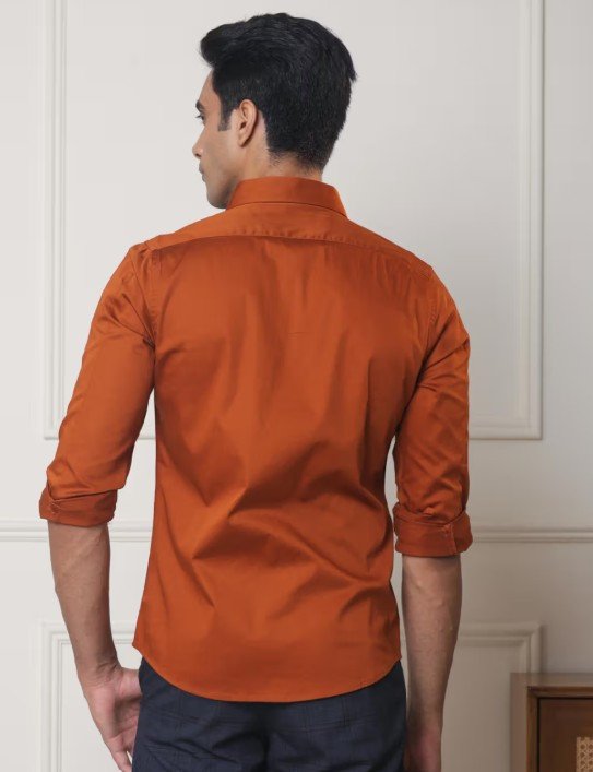 Men Copper Slim Fit Solid Spread Collar Cotton Satin Evening Shirt