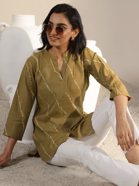 Our olive green printed silk blend straight short kurti features a mandarin notched neckline and three-quarter sleeves. Adorned with leheriya print, stylish buttons and cut-out detail, this charming style is ideal for work and beyond.