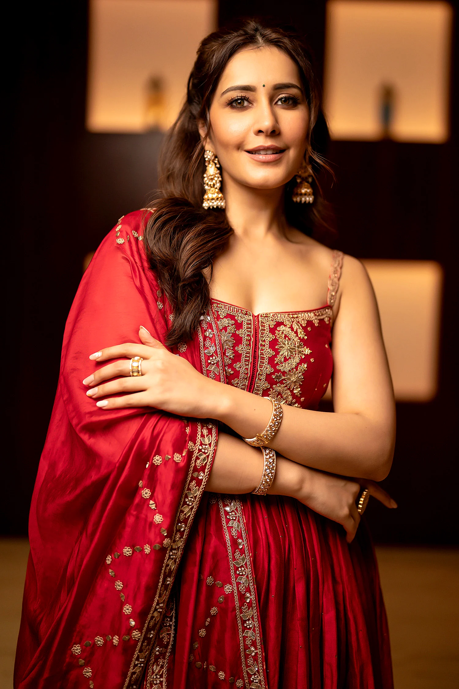 Red pleated anarkali with marodi and zardozi embroidered yoke. Paired with bandhani print gharara and tassel bordered dupatta.