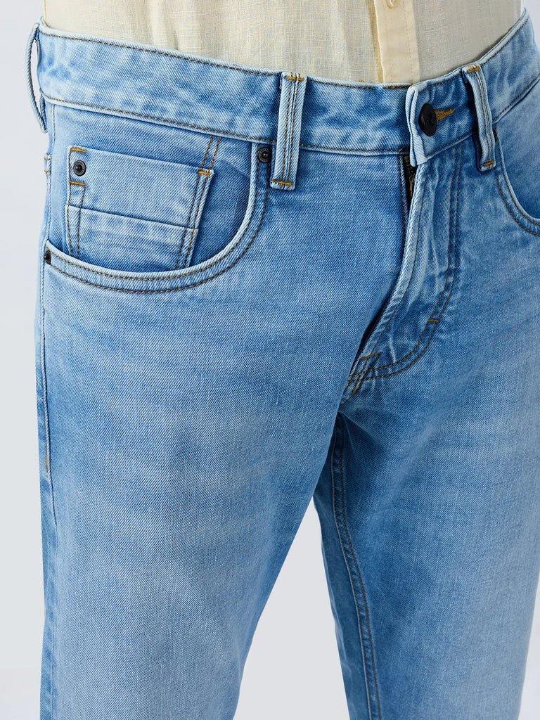Ankle (kano) 5 pocket ynr style jeans in mid blue shade denim fabric. clean premium wash in light blue shade . zipper fly and button fastner.