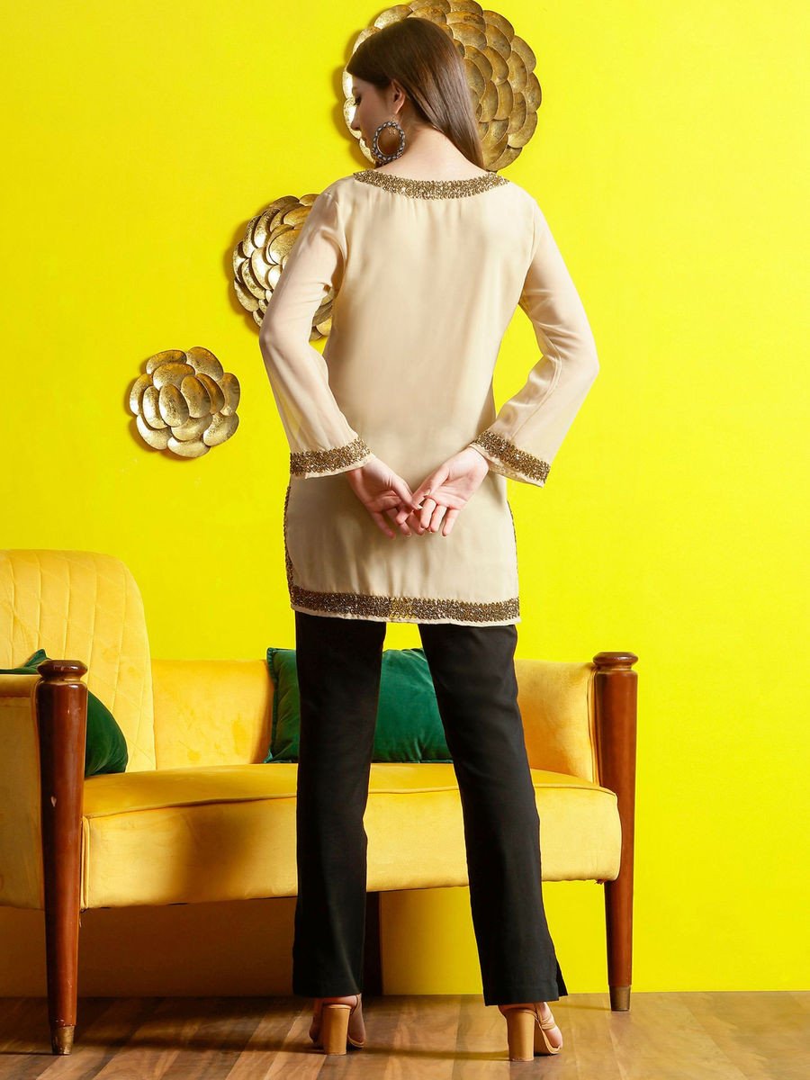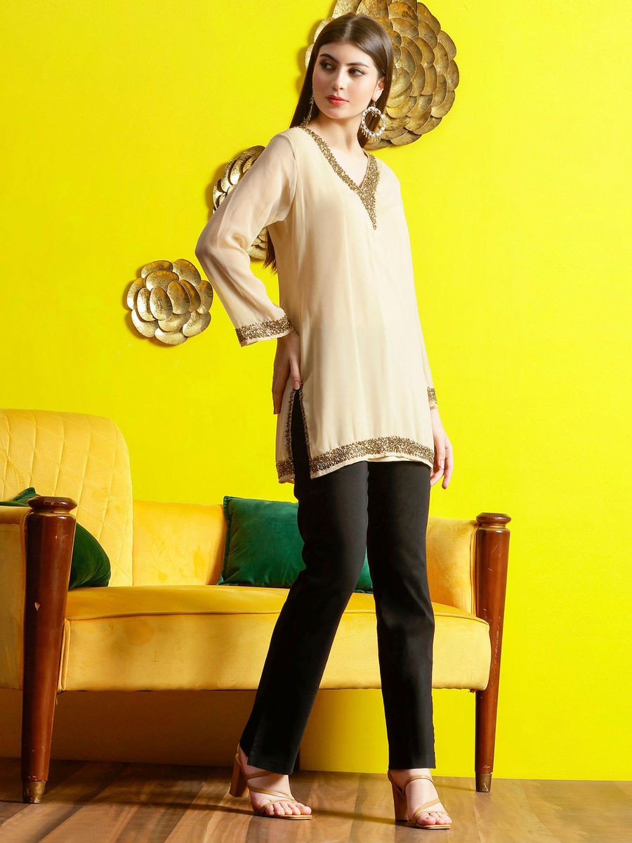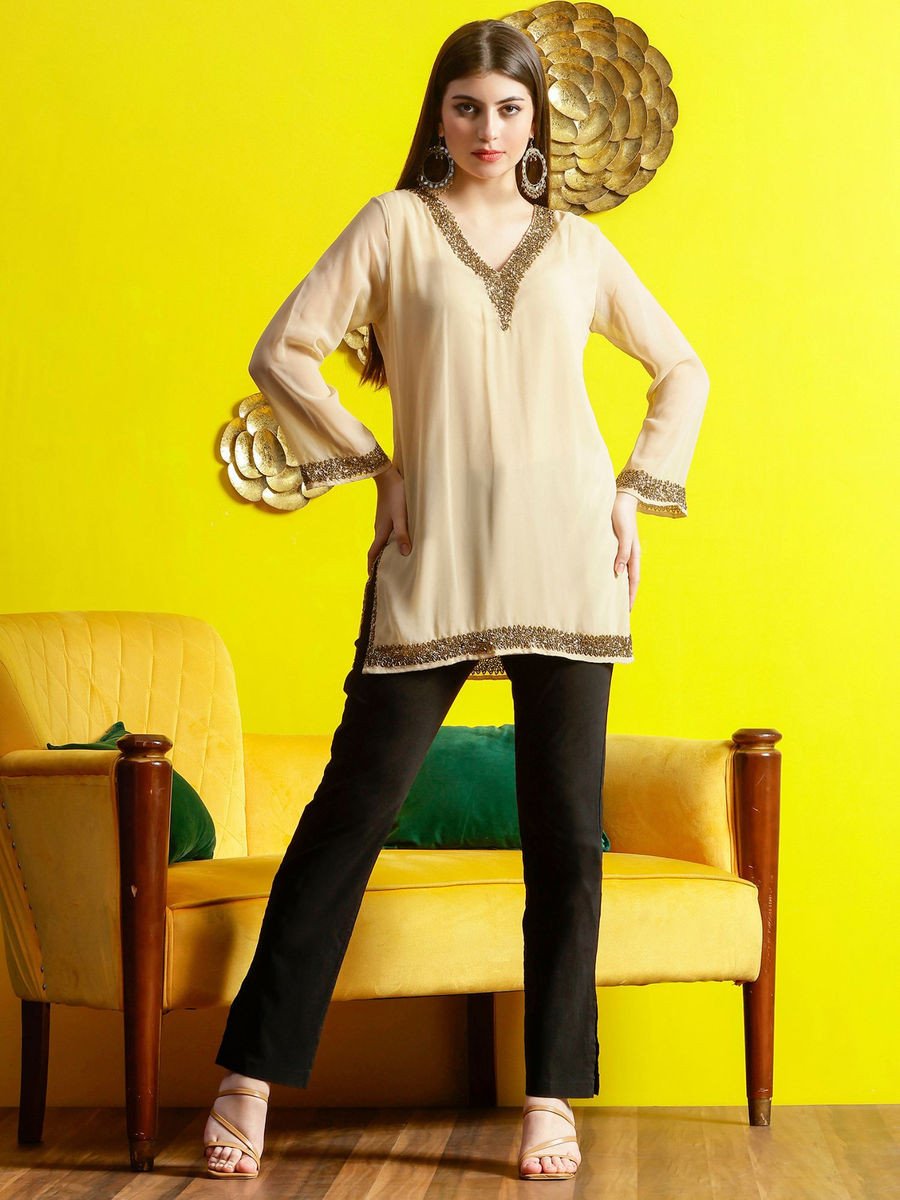 Beige Embellished V Neck Lining Kurti