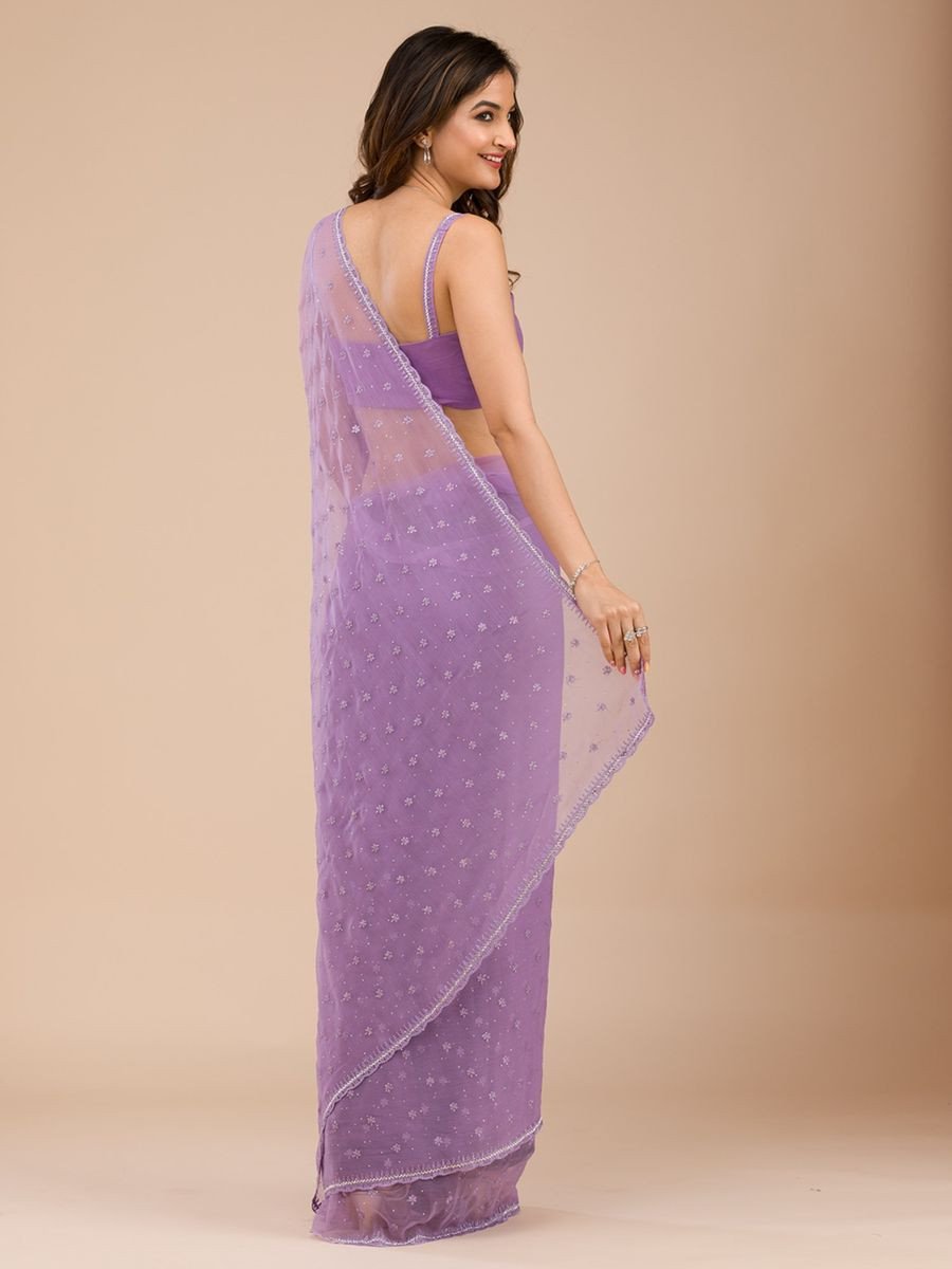Purple Thread Work Chiffon Saree with Unstitched Blouse