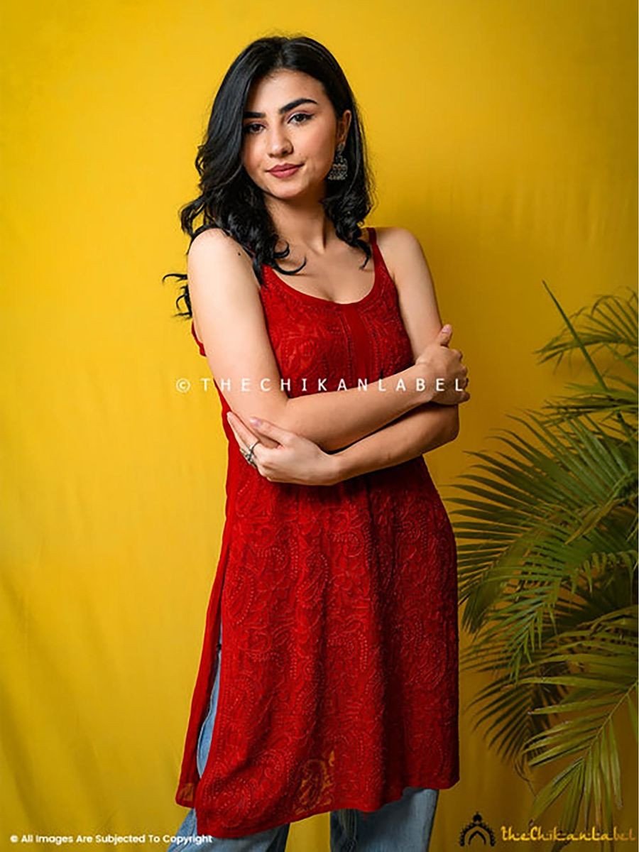Red Jia Viscose Chikankari Strappy Kurti